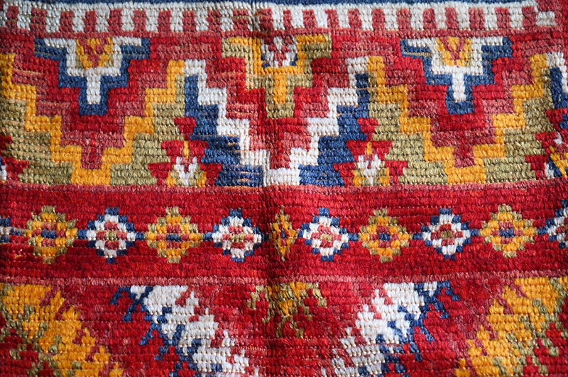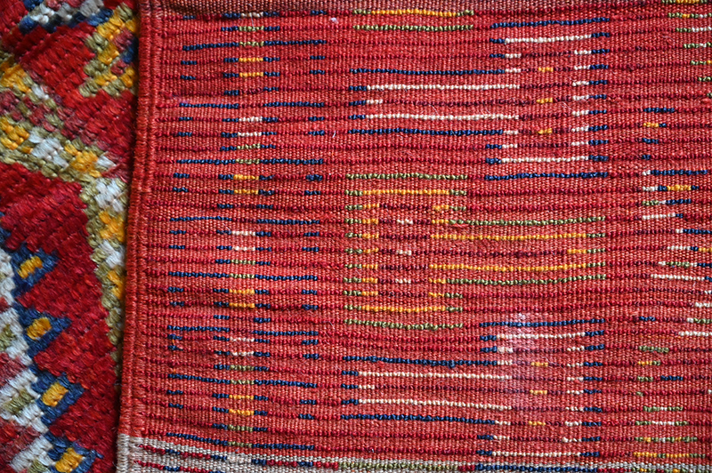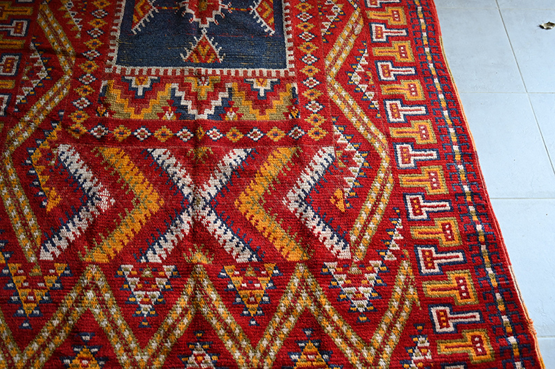 This carpets was woven by Aït Tamassine people, a berber tribe belonging to the Aït Ouaouzguit confederation and living in the Jbel Siroua, south west Morocco. It is woven using rows of symetric knots separated by many warps as is common pratice in this area; the wool is silky and warps are built in stripes of alternating colors. Period: ca 1950 -Dimensions: ca 275 x 150 cm/ 110″ x 60″.