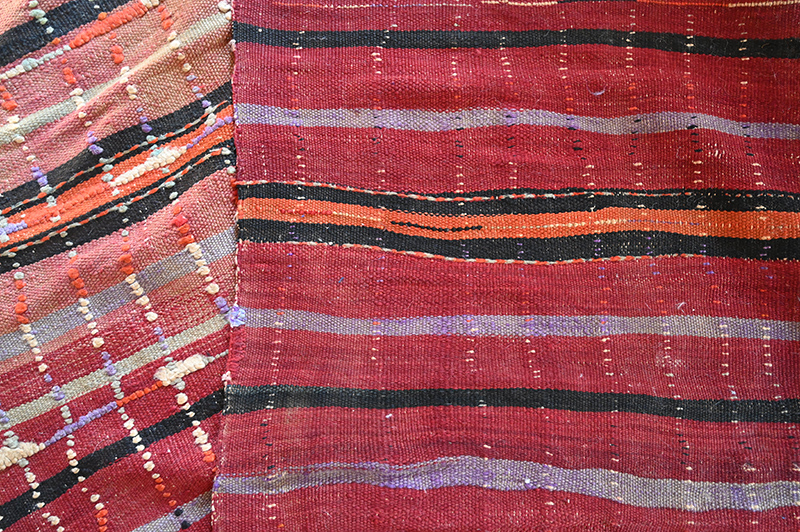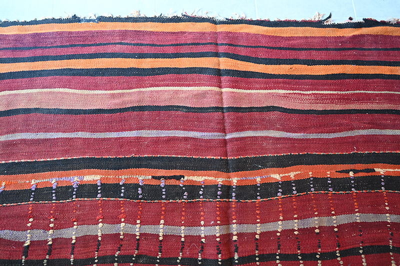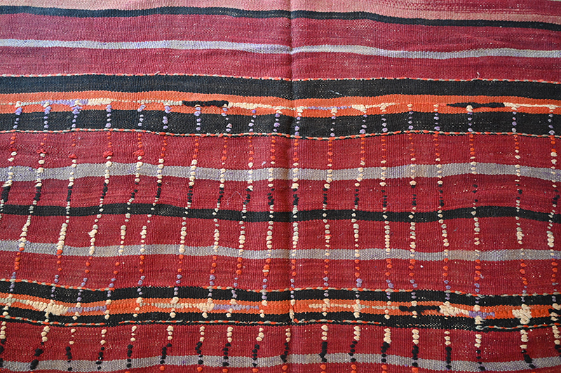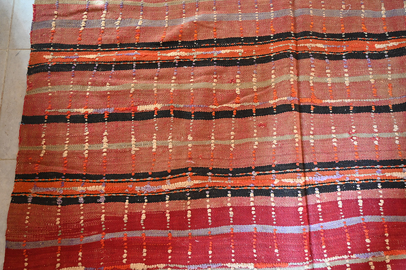 Ce grand tissage est destiné à l’origine à couvrir les empilements posés au centre de la tente. Empilement s de tapis , sacs, couvertures. La quasi totalité du mobilier de ces éleveurs de moutons était constituée de textiles produits par les femmes de la famille.