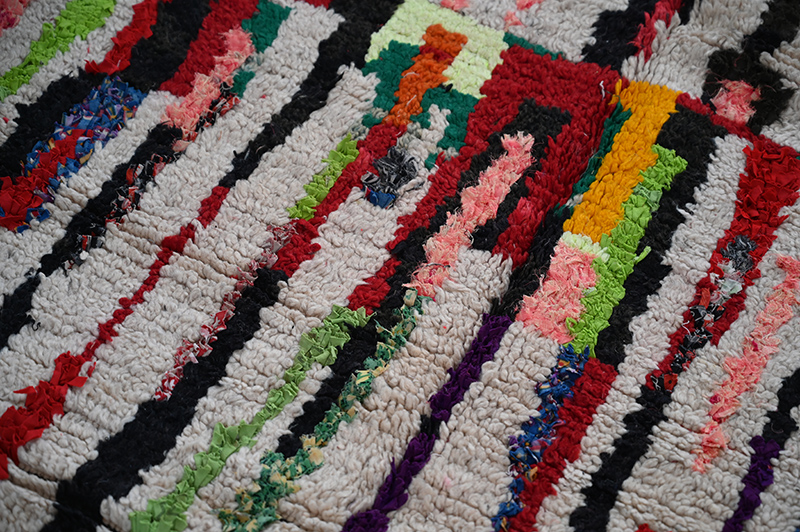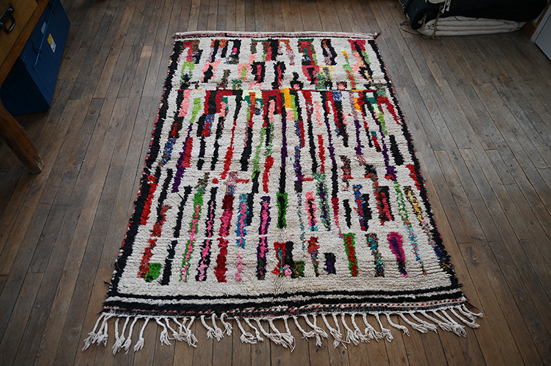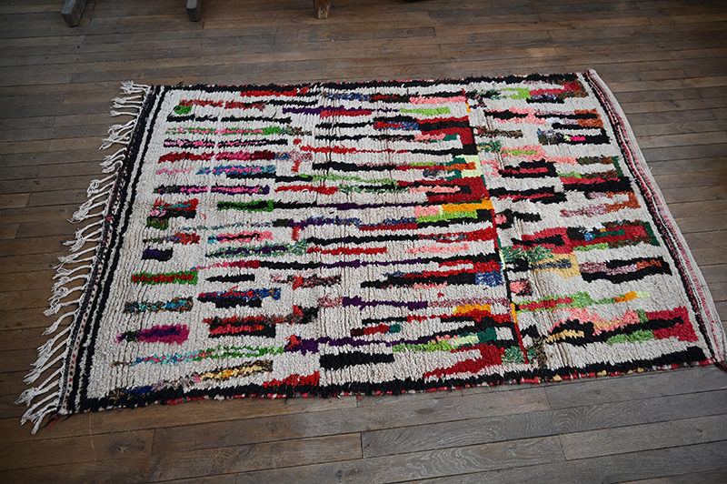 This carpet comes from the mountains above the Azilal city, woven by Bou Ouli ou Bou Guemmez people, whose carpets are traditionnally of black designs over a white field; here the weaver opted for colors while using a traditionnal theme. Period: ca 2000 – Dimensions: ca 200 x 130 cm / 80″ x 52″
