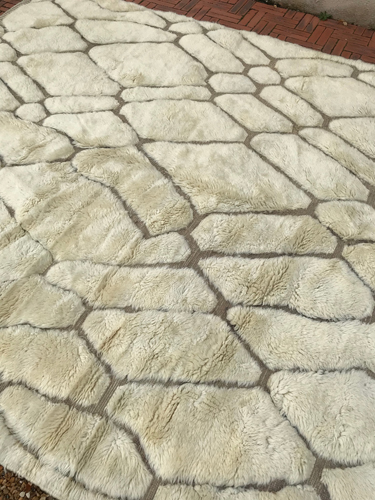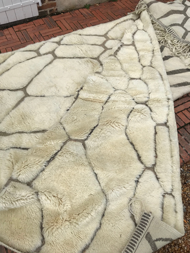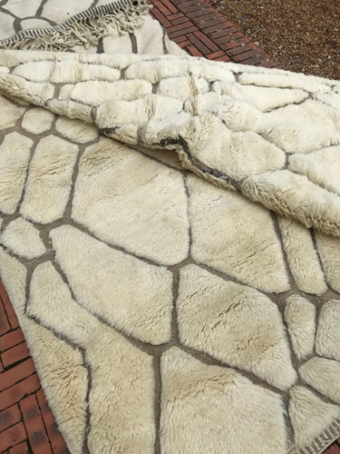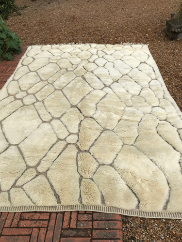 This carpet is new and inspired from the Beni Warain tradition in north eastern Morocco. As a recent creation, it finds its roots in this multisecular tradition of white carpets with dark designs, using an unusual but still traditionnal design made of undulating lines flat woven with a white piled field. This very specific practice is not new but was usually omly employed for straight lines. The result is quite elegant, offering to the eye a confortable and generous carpetwith a good woll thickness. Period: new – Dimensions: ca 360 x 240 cm / 144″ x 96″.