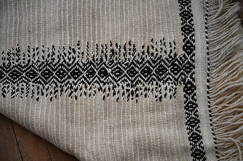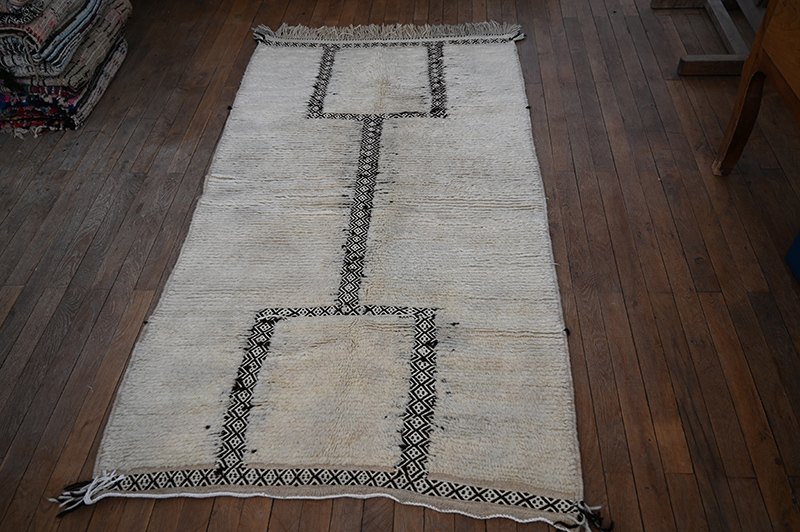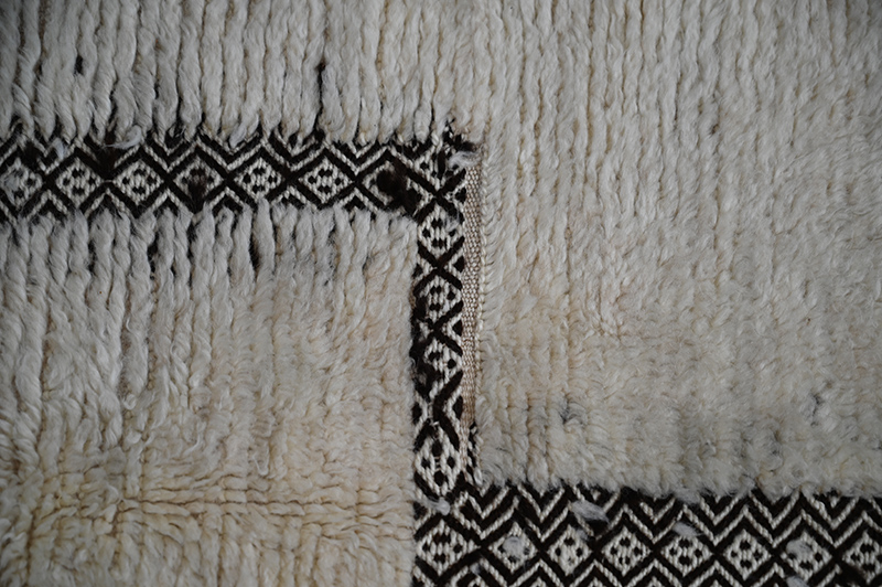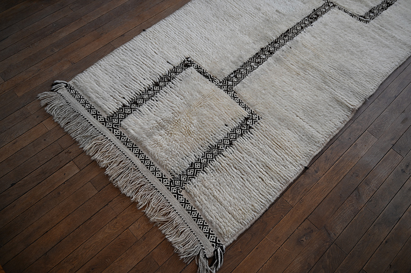 This is another white and black carpet woven in the Tazenakht area, in south western Morocco. Made using super local wools, it displays a non traditionnal design however built using a traditionnal “cordelage” technics often used in “glaoua” carpets and somatimes the zanafi, a local kind of kilim. Period: recent – Dimensions: ca 200 x 110 cm / 80″ x 44″.