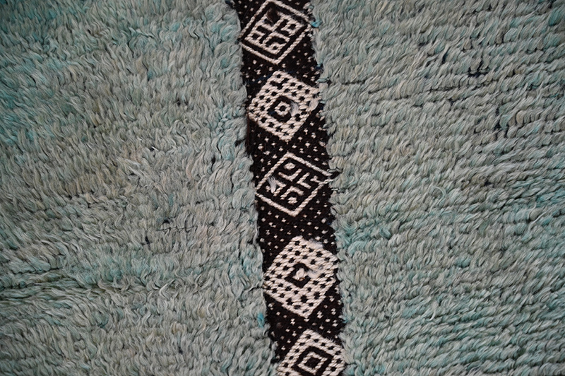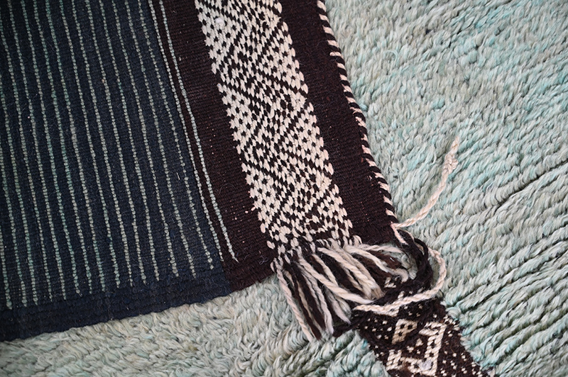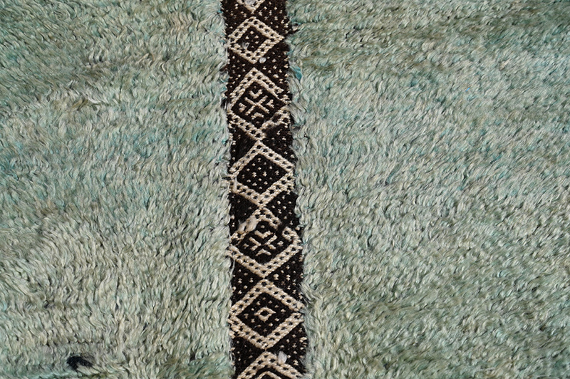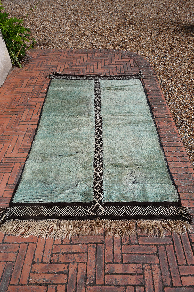 This is a very special – new – smal carpet. It originates in the Jbel Siroua but I label it as Tazenakht (the main regional souk) since it is not a pure traditionnal tribal carpet. Special because it associates traditionnal practices (symetric knots/glaoua work) and wools with a deliberate will to modernize the offer these weavers deliver to the market. This carpet uses a traditionnal technics and wool quality, but displays a non traditionnal Sirwa design. It however retains an elegance of good alloy. Period: new – Dimensions: ca 200 x 120 cm / 80″ x 48″ – Ref : Z0215