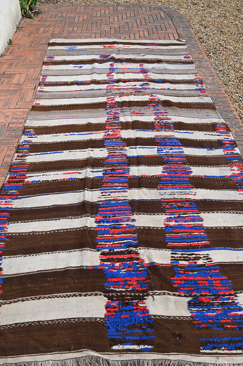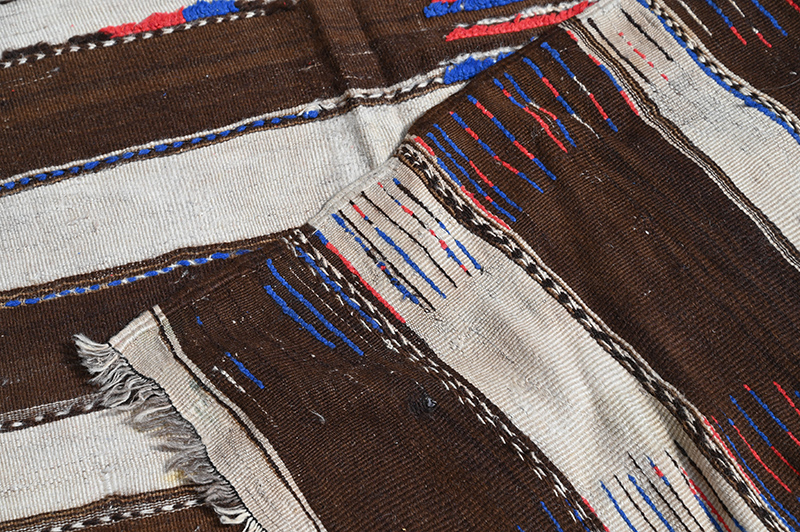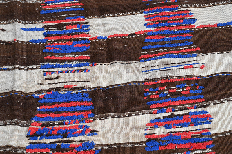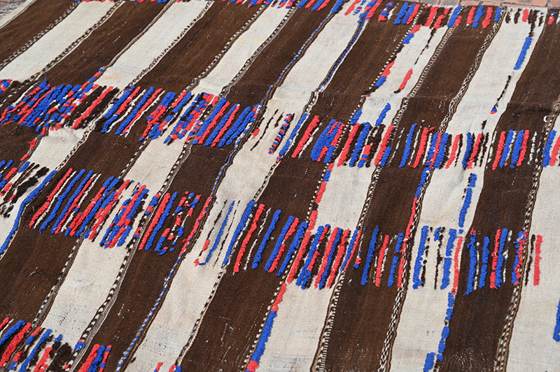 Ce hanbel proviendrait de la région de Demnate dans le centre du Haut-Atlas, à l’est de Marrakech. Si aucune documentation précise n’existe à ce jour permettant d’assurer cette provenance spécifique, le type de tissage peut cependant le laisser présumer. Le tissu de fond est une armure toile simple en laines non teintes, les dessins étant constitués de noeuds symétriques de laines colorées. Il est par ailleurs très probable que ce type de tissage ait servi de sac comme l’ont été des tissages similaires provenant de la région de l’Ourika mais traités uniquement en tissage plat et très peu de couleurs. Dimensions: env 355 x 140 cm.