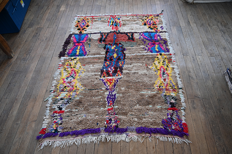 Here is a nice little carpet originating in the Tadla plain. East of the Hauz of Marrakech, and north of the High Atlas. Woven using various types of fibers, all of industrial origin and re-employed. It is built according to ancient practices, with no borders and in segments/registrers, while integrating multicolored checkerboards. Period: post 2000 – Dimensions: ca 170 x 125 cm / 68″ x 50″
