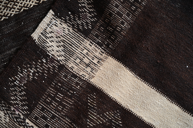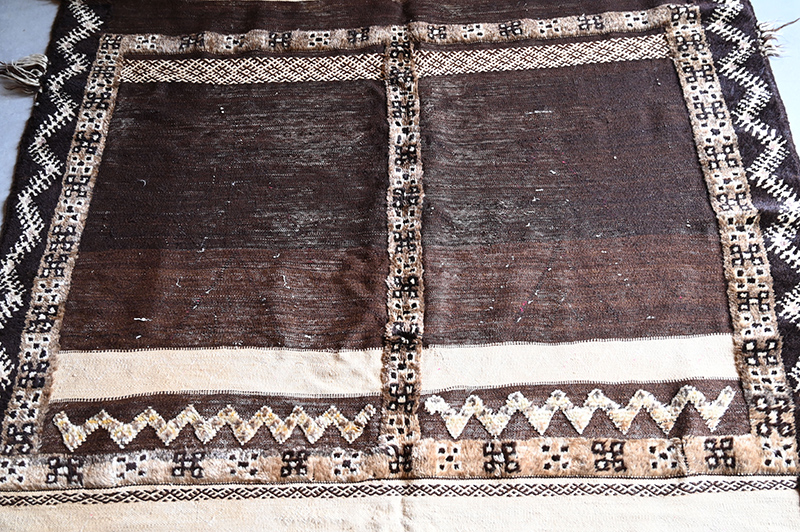 Le dessin est un classique des tapis dit « glaoua »: un cadre assez large, enserrant une bande verticale et deux ou plus bandes horizontales séparées par des zones tissées à plat. La laine est de très belle qualité, de ce noir spécifique au Jbel Siroua, très recherché et prisé par les tisseuses- Période: 1970/80 – Dimensions: env 235 x 140 cm.