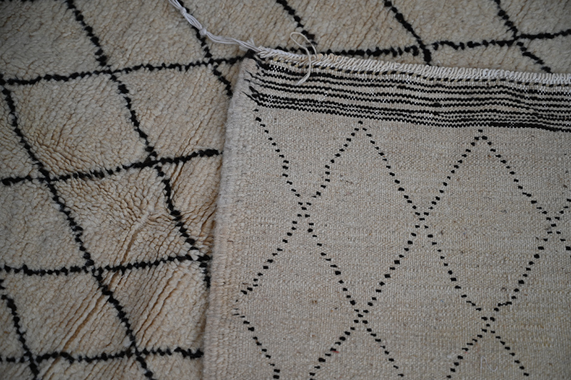 Ce tapis, neuf, provient de la région de Tazenakht et a très probablement été tissé dans le Jbel Siroua qui domine ce village souk principal de la région en question. Il est tissé au noeud symétrique, usant de laines blanches et noires locales et donc belles. Relativement fin, il montre un dessin de grille losangique qui s’il n’est pas typique de cette région, est cependant trouvable dans la quasi totalité des tapis de tribu berbères du Maroc, le losange étant une figure de base et très ancienne de leurs répertoires de motifs. Emploi de thibaude anti glisse recommandé sur sols lisses. Période: neuf – Dimensions: env 150 x 120 cm.