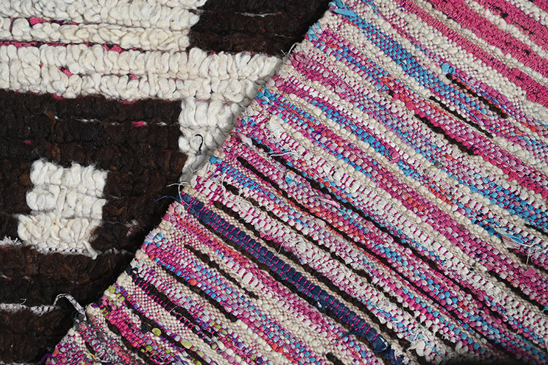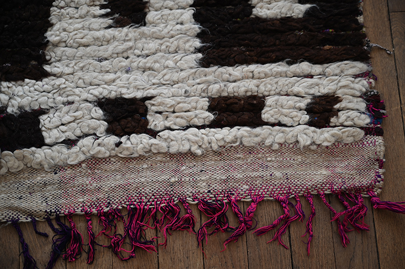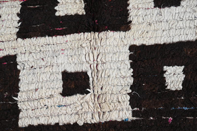Ce tapis use d’une thématique classique chez les tapis de l’Ourika auxquels il appartient. Mais dans ce cas elle est extrêmement simplifiée, lui conférant ainsi une superbe qualité graphique . Ce tapis de l’Ourika est tissé de laines noires et de laines blanches au noeud symétrique, sur des chaînes de fils de coton industriels; une pratique qui a tendu à se répandre de façon assez généralisée depuis les années 70. Période: après 2000 – Dimensions: env 180 x 130 cm.