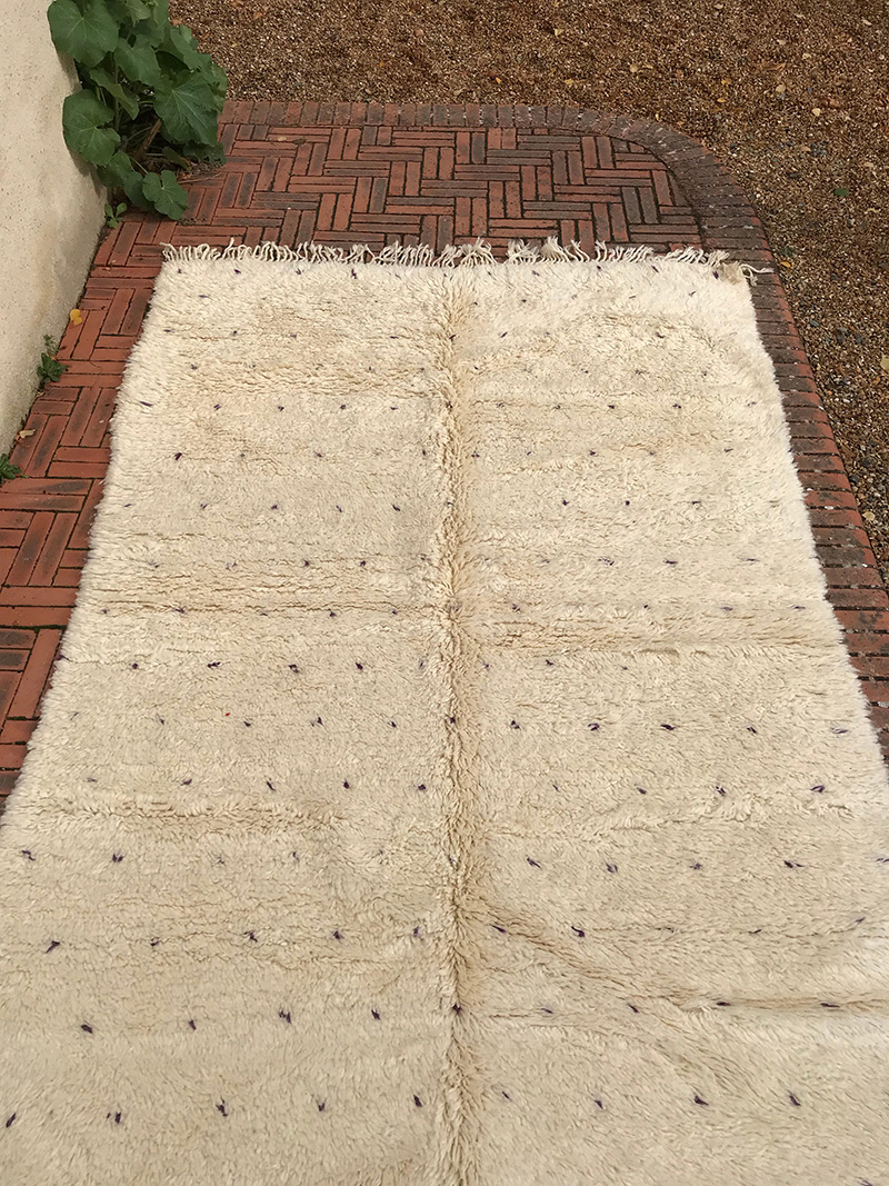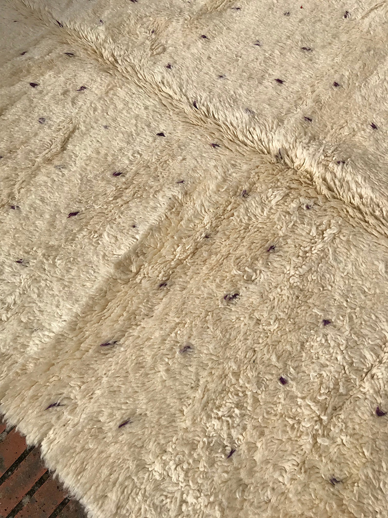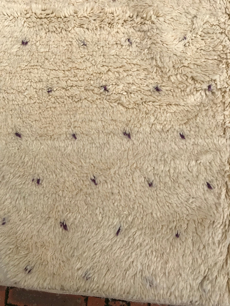 This is a new carpet, inspired from the Beni Warain practices regarding technical aspects: wools and knots. However, the design is a pure creation of the morocccan designers under markets influences. The field of the carpet is a plain white strewed with purple dots made of a single knot. This discreet design leads to a carpet at ease in many interiors. Period: new – Dimensions: ca 250 x 150 cm / 100″ x 60″.